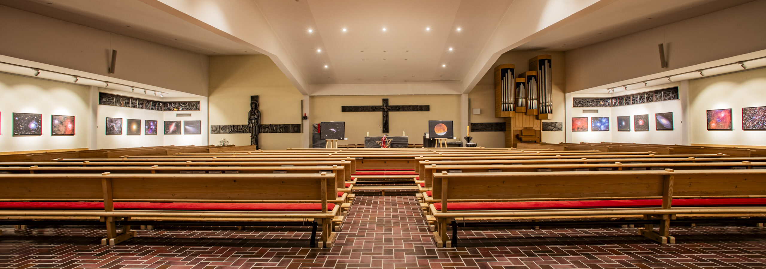 Die Innenausstattung der Kirche entwarf Prof. Robert Herfert. 1994 ergänzte Prof. Manfred Seibt den Kirchenraum durch einen modernen Kreuzweg (Acryl auf Karton).